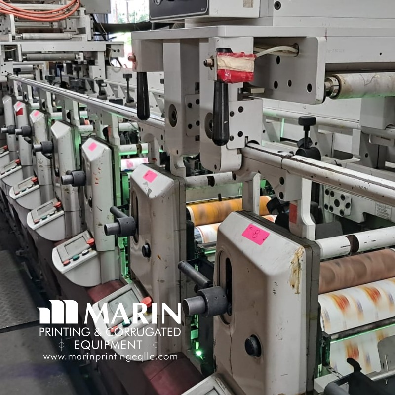 Year 2006 Serial # 1344574 Model XP5000 Includes stacker Turnbar Max 13 inches Can print Adhesive Paper 9 colors 9 UV 2 Laminators Comes with cart to remove stations Extra dies Extra parts