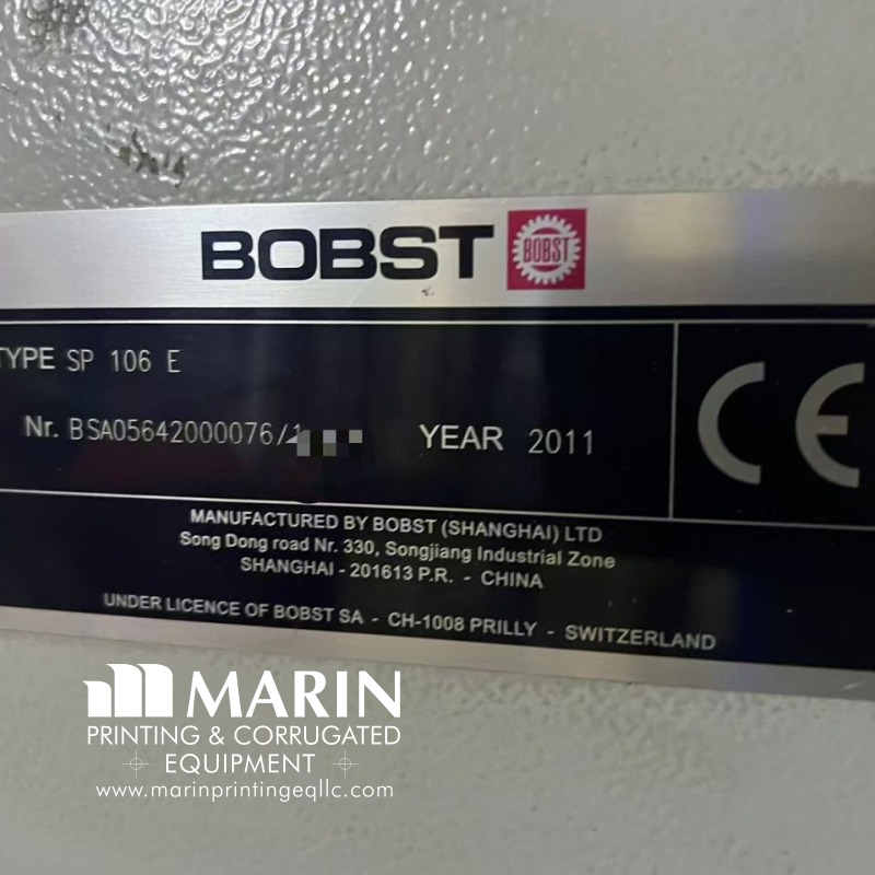 Auto Flat Platen Die Cutting StrippingMachine Brand:BOBST Model:SP106E Year: 2011 Made in Shangai Max.sheet:1060x740mm Min.sheetsize:310x406mm Thickness:1-9mm Flutetypes:A,B,C,E,F,BC,AC,AB Speed:5500sheets/min. Machinedimension:7500x1800x2800mm Total weight:20 Tons Die cutting pressure: 300 Tons Still in production